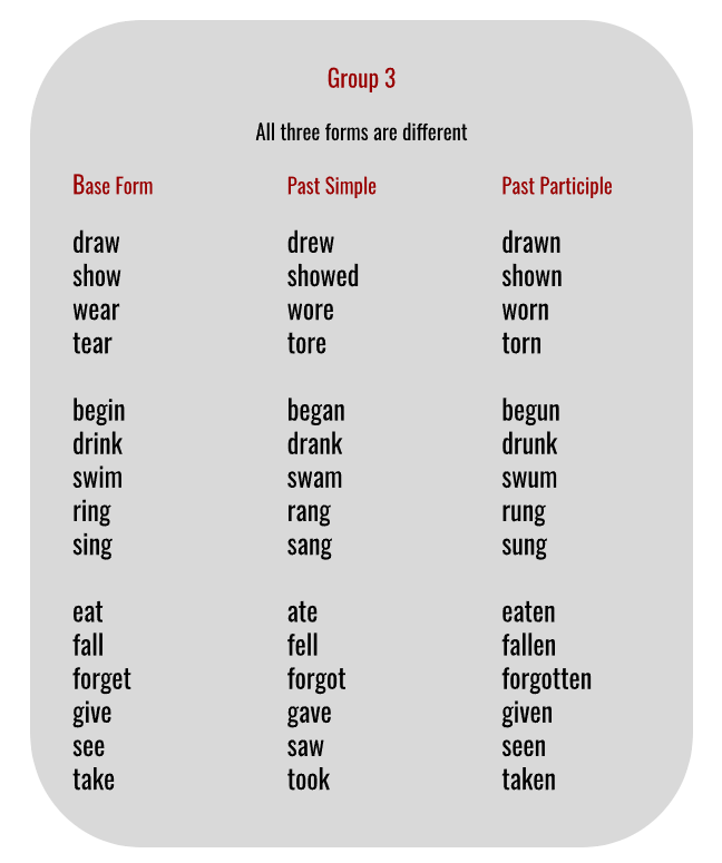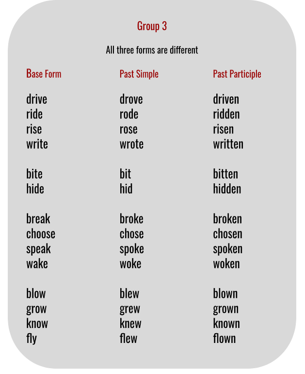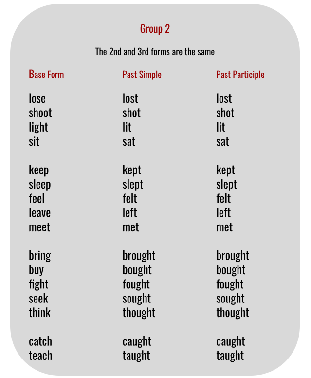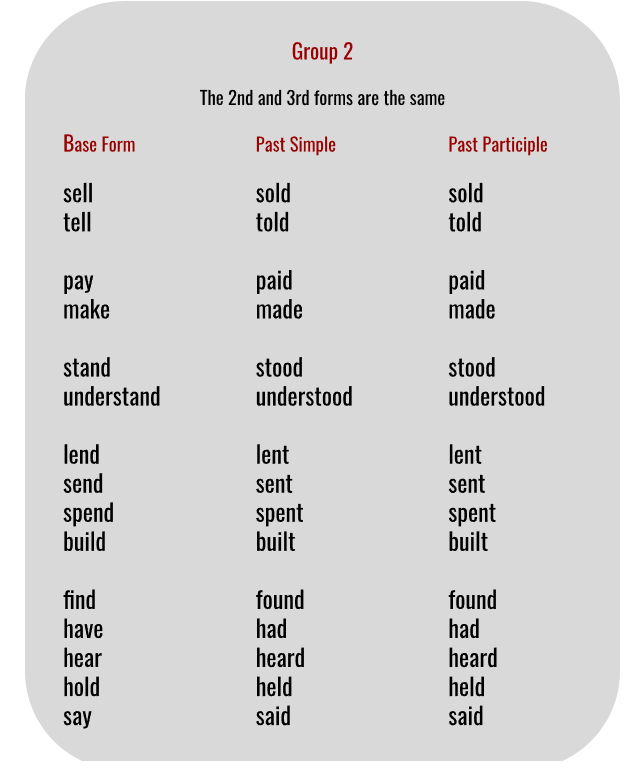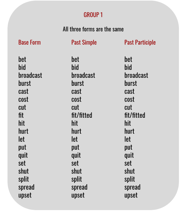 Irregular verbs don’t follow any rules, but luckily some follow a similar pattern. I have created a few groups for you to help you memorize the verbs. You will notice that learning from the lists created by me is much faster and more effective than memorizing the alphabetical list you already have.